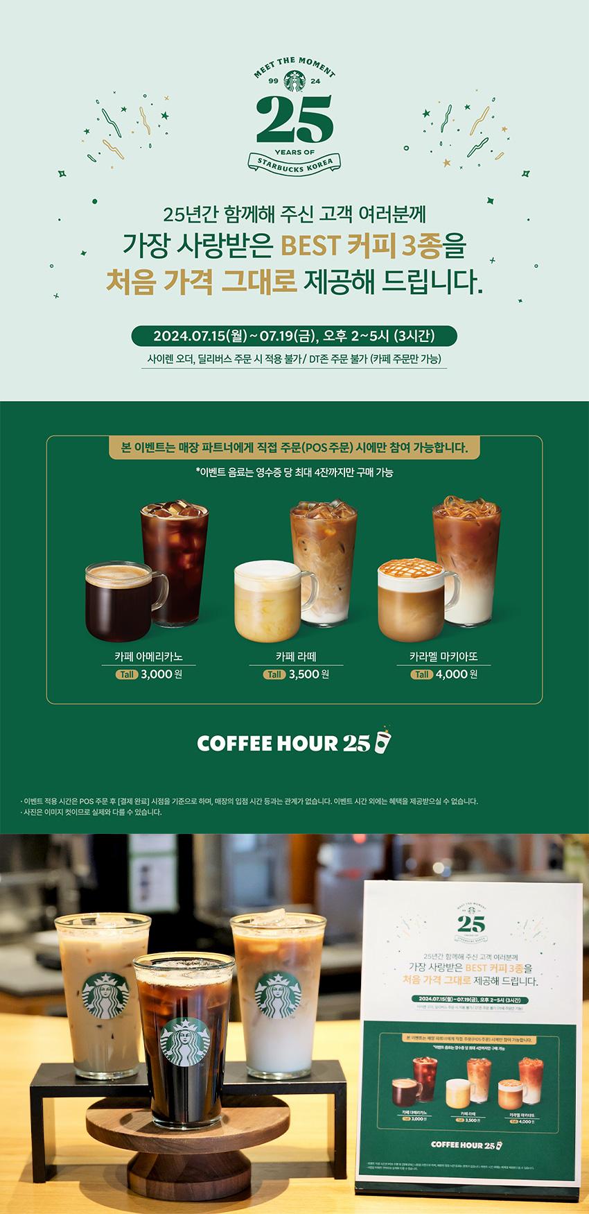 스타벅스 코리아가 오는 15일부터 5일간 베스트 음료 3종을 스타벅스 코리아의 최초 출시 가격에 제공하는 ‘커피 아워 25(COFFEE HOUR 25)’ 이벤트를 전개한다.