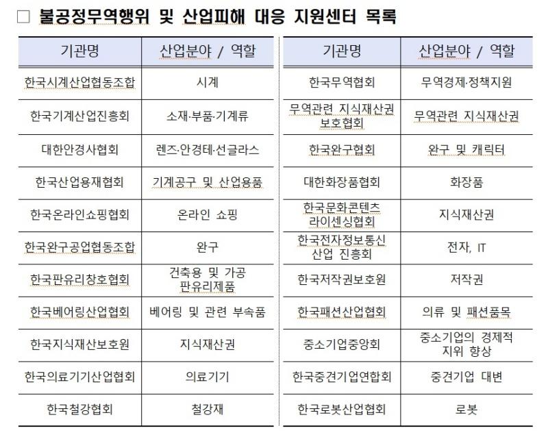 산업통상자원부 무역위원회는 19일 불공정무역행위로 인한 우리 기업의 피해 대응을 포괄적으로 지원하기 위해 업종별 협회·단체 위주로 22개 ‘불공정무역행위 및 산업피해 대응 지원센터’를 구성해 이날 출범 간담회를 열었다고 밝혔다.