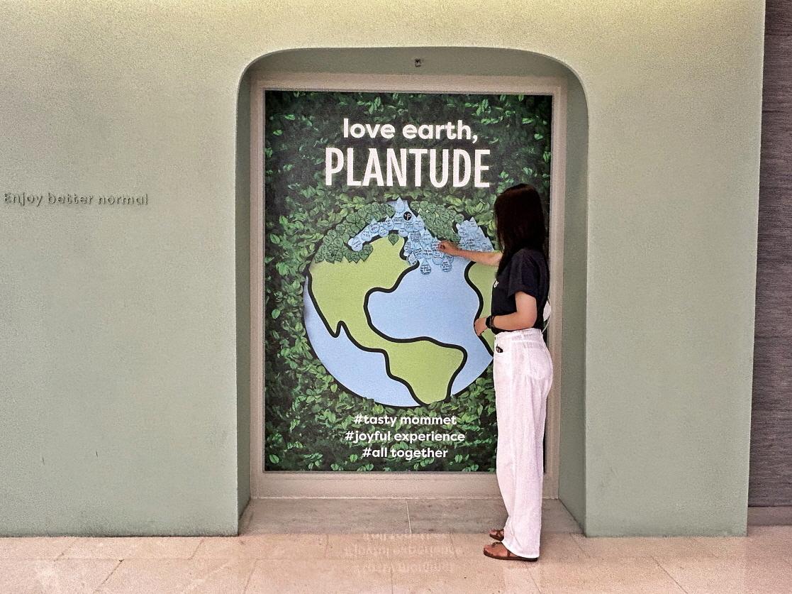 플랜튜드 코엑스점에서는 식물성 한 끼 식사를 경험하며 탄소 배출 감소를 통한 더 건강하고 지속 가능한 지구를 만드는데 기여하고자 지구사랑 포토존을 조성했다. 지구 모양의 픽토그램 포토존에는 ‘love earth, PLANTUDE’ 라는 메시지를 통해 지구환경에 대한 긍정적인 영향력을 전파하고자 했다. 고객들이 물방울과 나뭇잎 모양의 포스트잇에 지구사랑의 메시지 ‘지구에게 한마디’를 적어 지구 모양 포토존에 메시지를 부착하면 건강한 지구가 완성되는 컨셉이다.