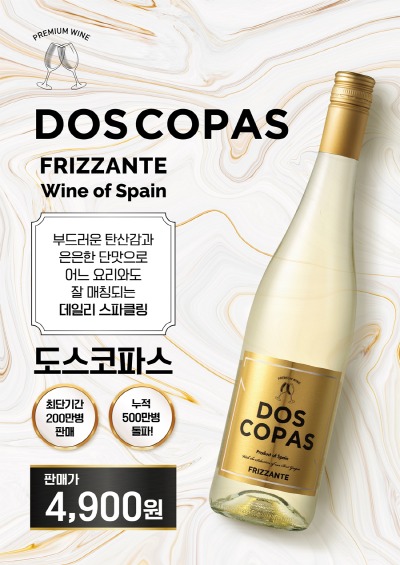 이마트는 지난달 출시한 초저가 화이트 와인 ‘도스코파스 소비뇽 블랑’의 흥행에 힘입어, 스파클링 와인 신제품 ‘도스코파스 프리잔떼(Dos Copas Frizzante)’를 출시한다. 프리잔떼는 이탈리아어로 탄산감이 적은 ‘약발포성 와인’을 뜻한다.