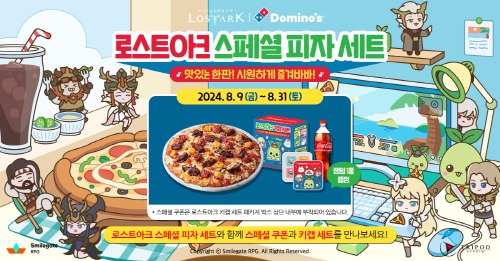 8월 9일부터 오는 8월 31일까지 진행되는 이번 콜라보레이션 기간 동안 로스트아크 마스코트 ‘모코코’와 게임 내 ‘에스더’ 캐릭터들을 테마로 한 디자인으로 변경된 패키지와 함께 로스트아크 스페셜 쿠폰과 한정 굿즈가 포함된 로스트아크 스페셜 피자 세트가 출시된다.
