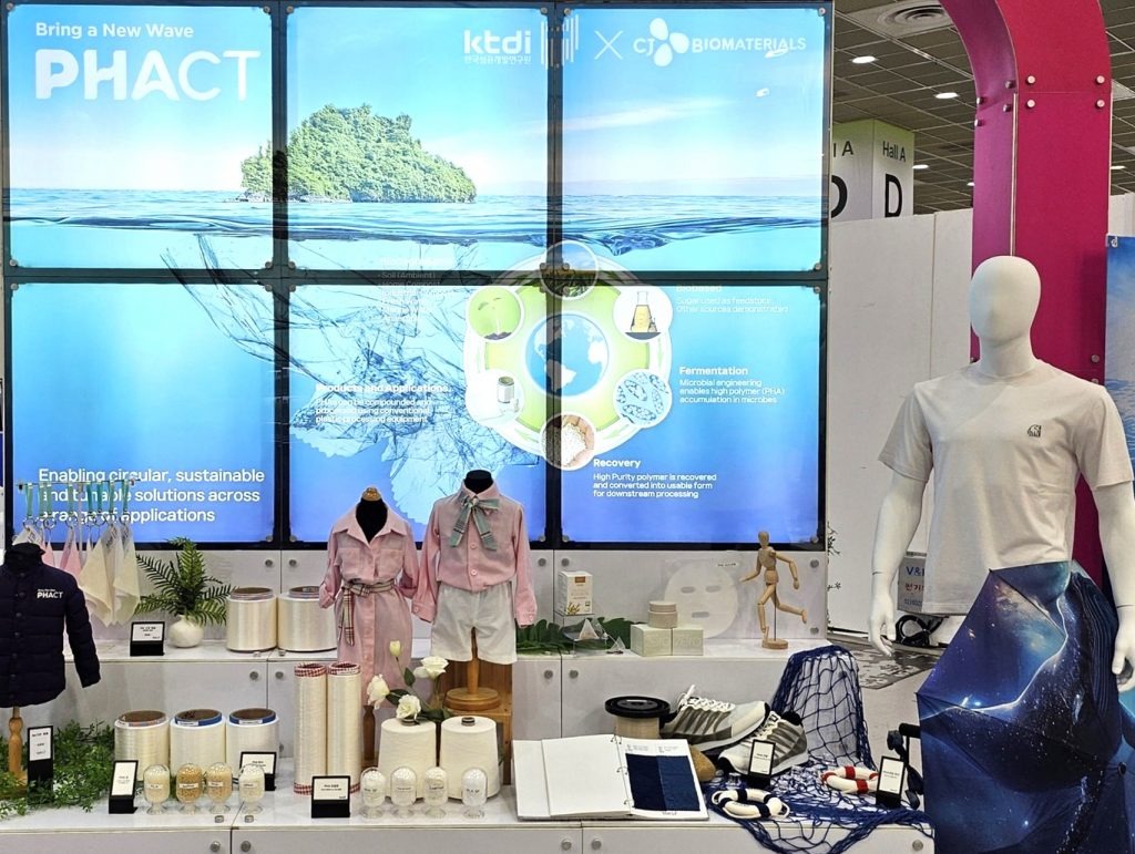 CJ제일제당이 선보인 제품은 PHA를 적용한 실과 의류용 섬유, 부직포 등 각종 소재와 이를 활용해 만든 인도어∙아웃도어 의류와 신발 등의 샘플이다. 특히, 유명 아웃도어 패션기업 케이투코리아그룹과 협업해 전시한 티셔츠가 큰 관심을 받았다. 섬유는 가공 기술 난이도가 높은 분야여서 그동안 PHA 적용이 어려웠다. CJ제일제당은 한국섬유개발연구원(ktdi), 유진한일합섬, GH신소재 등과 3년에 걸친 공동 연구개발을 통해 PHA를 비롯한 바이오 소재로도 일반 섬유와 같은 물성과 상품성을 구현하는데 성공했다.