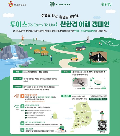 스타벅스 코리아(대표이사 손정현)는 한국관광공사, 환경재단과 함께 오는 10월 6일까지 인구감소 지역 및 지역 경제 활성화를 위한 ‘투어스(To Earth, To Us): 친환경 여행 캠페인’을 전개한다고 밝혔다.