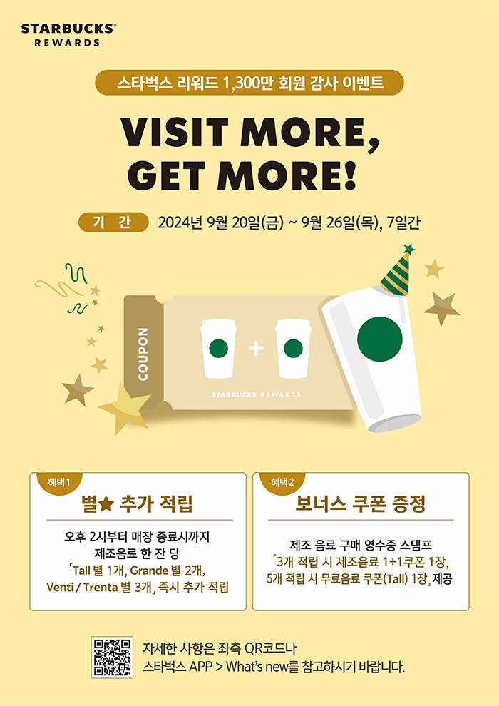 아울러, 동일한 기간 내 톨 사이즈 이상 제조음료를 구매한 영수증 개수에 따라 스탬프를 적립하여 스탬프 3개를 적립하면 제조음료 1+1 쿠폰을, 5개 적립 시에는 톨 사이즈 무료 음료 쿠폰을 추가로 증정한다. 스탬프 이벤트 관련 자세한 내용은 스타벅스 앱을 통해 확인 가능하며, 쿠폰은 10월 7일에 등록된 계정으로 일괄 지급될 예정이다.