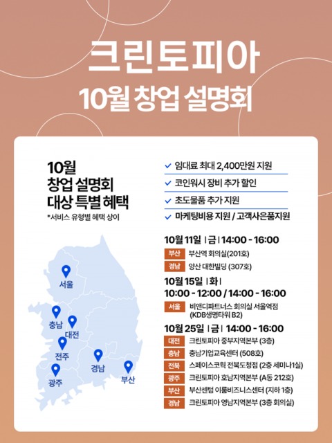 세탁 전문 기업 크린토피아가 예비 창업자를 위해 오는 11일부터 25일까지 전국 7개 도시에서 10월 창업설명회를 진행한다.