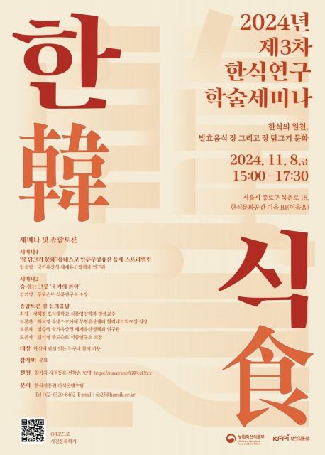 한식연구 학술세미나는 11월 6일(수)까지 선착순 30명을 모집하며, 네이버폼 링크(https://naver.me/GWezUhcc) 또는 QR코드를 통해서 사전 신청할 수 있다.