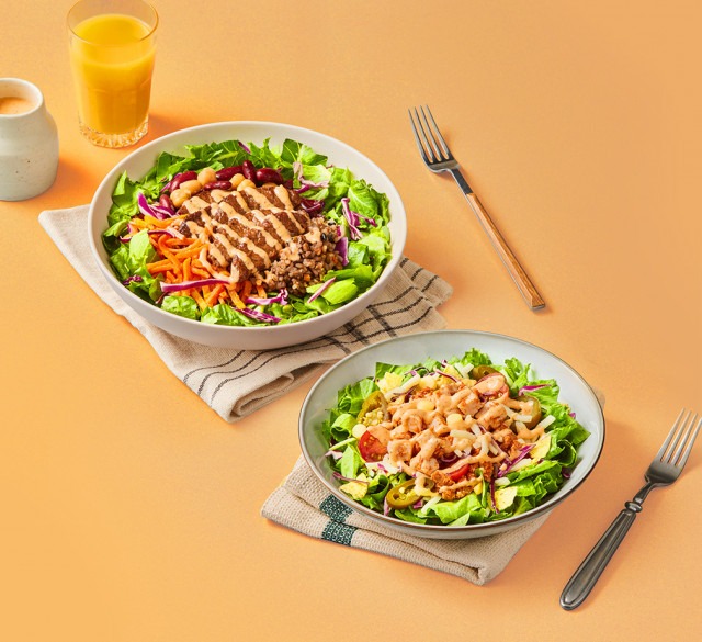 크런치 나초 더블치즈 샐러드는 이국적 맛의 샐러드다. 매콤하게 양념한 돼지고기와 닭가슴살 토핑에 나초칩을 더해 바삭한 식감이 특징이다. 별첨한 갈릭페퍼 드레싱과 치즈가 풍미를 더한다. 또띠아에 싸서 브리또, 퀘사디아로 즐길 수 있다.